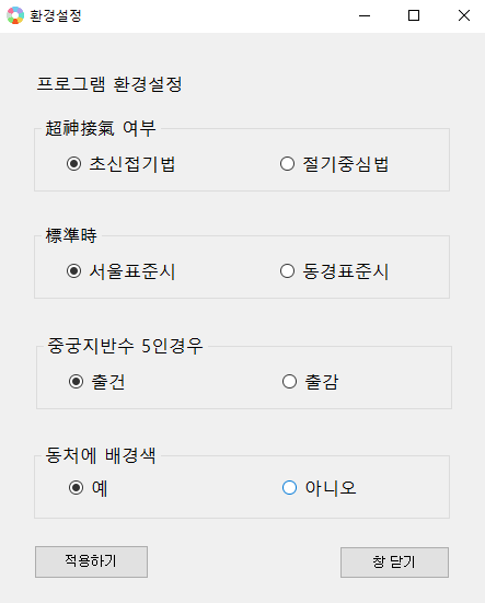 출감을 선택하면 출감에 맞게 홍국수, 신살등이 같이 바뀌게 됩니다. 바탕오국이 달라지기도 합니다.
