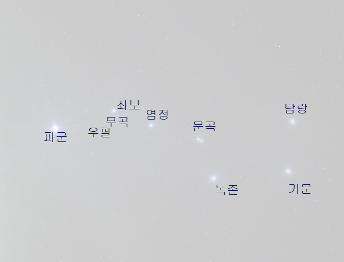 월장은 북극성을 중심점으로 해서 북두칠성의 꼬리인 파군이 어느 방향을 향하고 있는가를 보는것 입니다.(지두법)