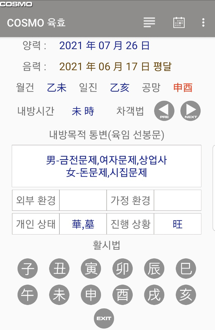 위의 이미지는 무료육효어플인 'COSMO 육효'라는 어플에 넣어놓은 것입니다.