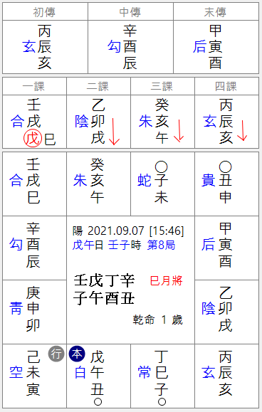 이날 일진이 무오일로 양일이라 천반중에 양이 있는 4과 (진토가 양이므로)가 초전으로 발용됩니다.