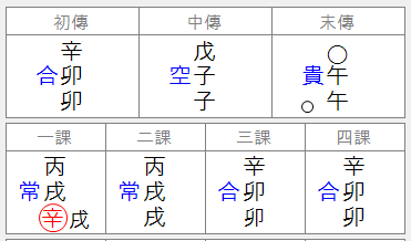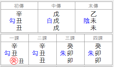 복음이고 극적도 없고 신묘일인 음일이라 3과가 초전으로 발용됩니다.