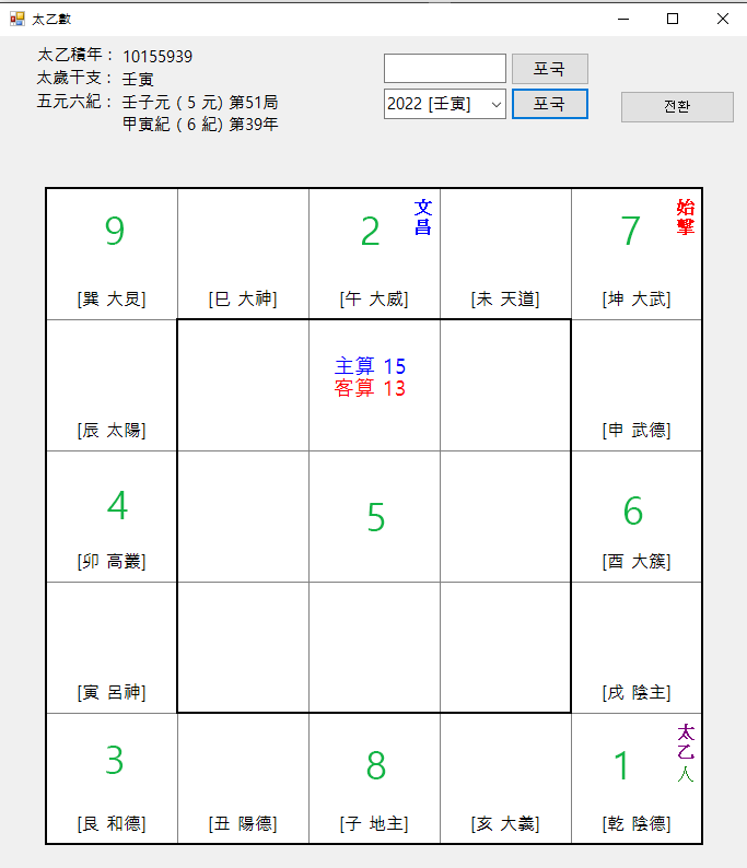 문창이 있는 리궁은 2, 곤궁은 7 , 태궁은 6 그 다음 건궁은 태을이 있으니 태을이 있는 궁의 직전(直前)까지 계산하므로 태을이 있는 궁은 포함되지 않습니다.