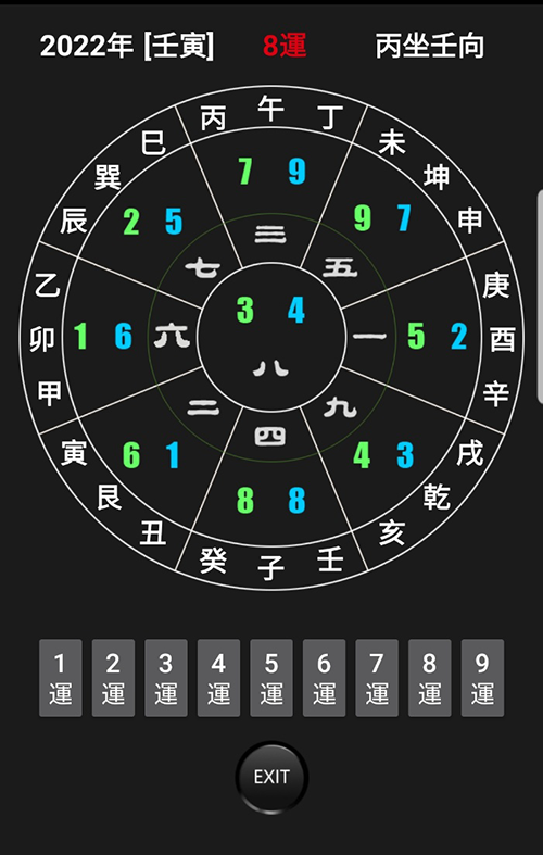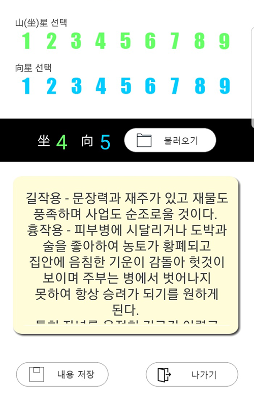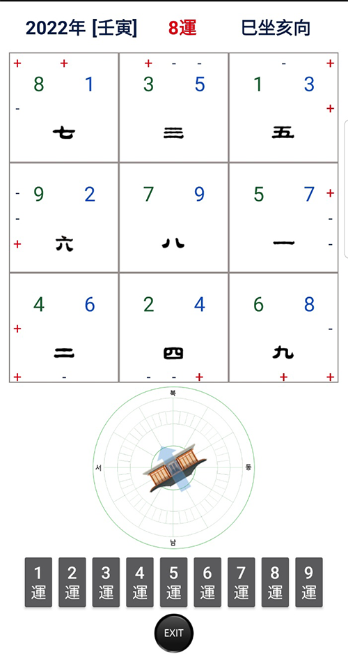 운에 따라 좌향을 터치(또는 측정)하면 산성과 향성을 포국해 주는 어플 입니다.
