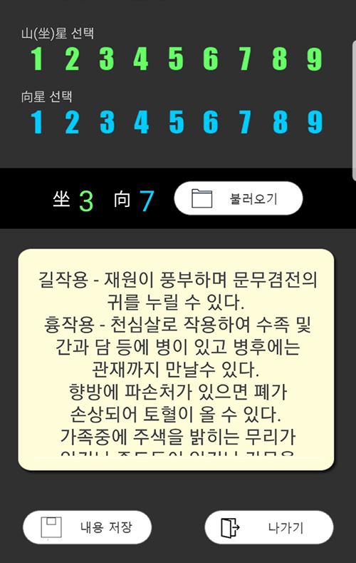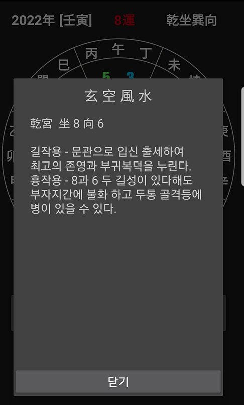 녹색숫자인 山(坐)星과 파란색 向星을 터치하면 아래와 같이 팝업창(다이얼로그 창)에 해설이 나옵니다.