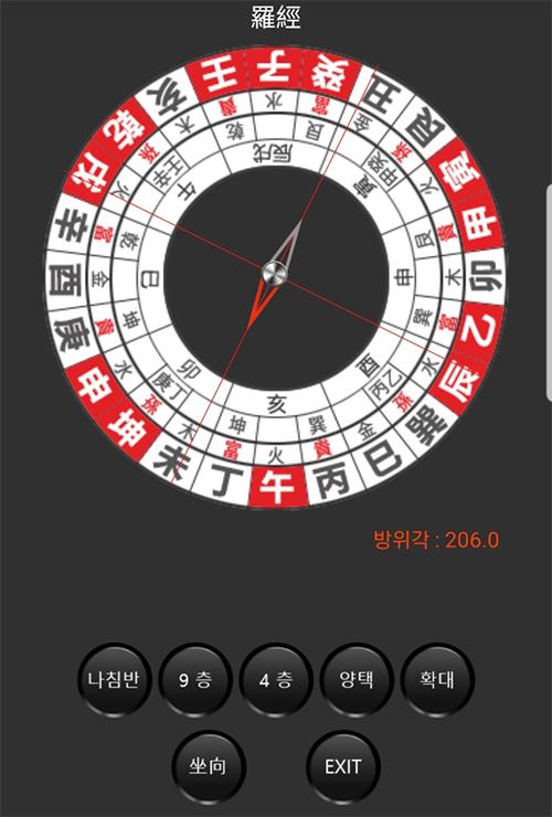 그 외에는 아래와 같이 기본적으로 나침반 기능과 4층, 9층, 양택등이 있으며 당연한 이야기 지만