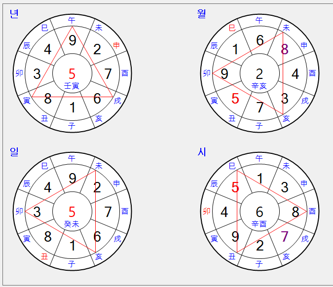 구궁도를 원으로 표시 한것은 예전부터 있었습니다. 그러나 구성학의 구궁도를 원으로 표시하여 이중테두리로 처리하고 파살을 붉은색으로 암검살을 보라색으로 표시한 것은 제가 처음 시도한 프로그램입니다. 굳이 저작권 등록은 하지 않겠습니다.