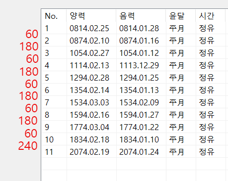 오른쪽에 814년 부터 2074년 까지 나오는 모든 날짜들이 갑오년,병인월, 병자일,정유시 입니다.