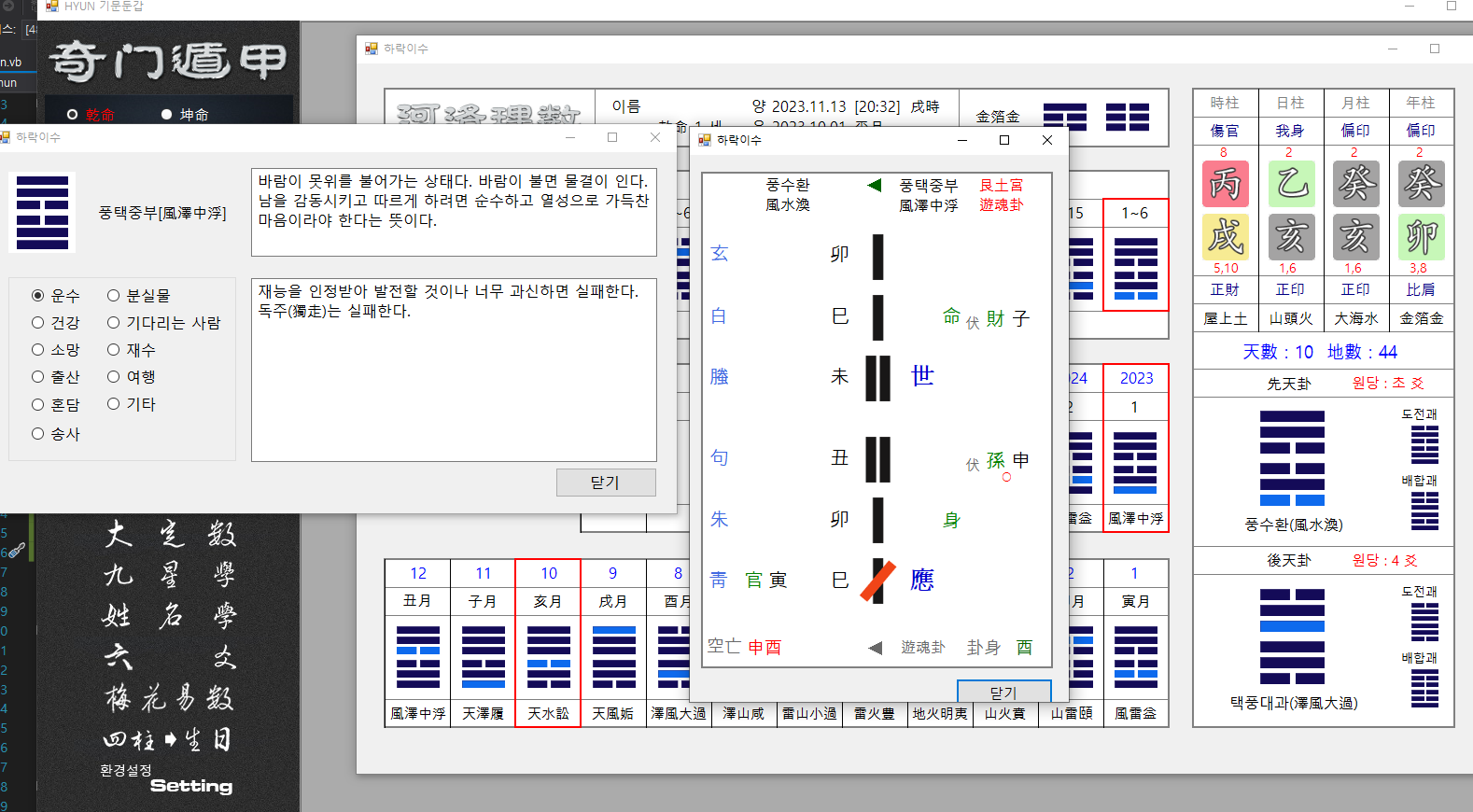 괘 이름에 마우스 왼쪽버튼 클릭하면 해단이 나오고 오른쪽 버튼 클릭하면 육효가 나옵니다.