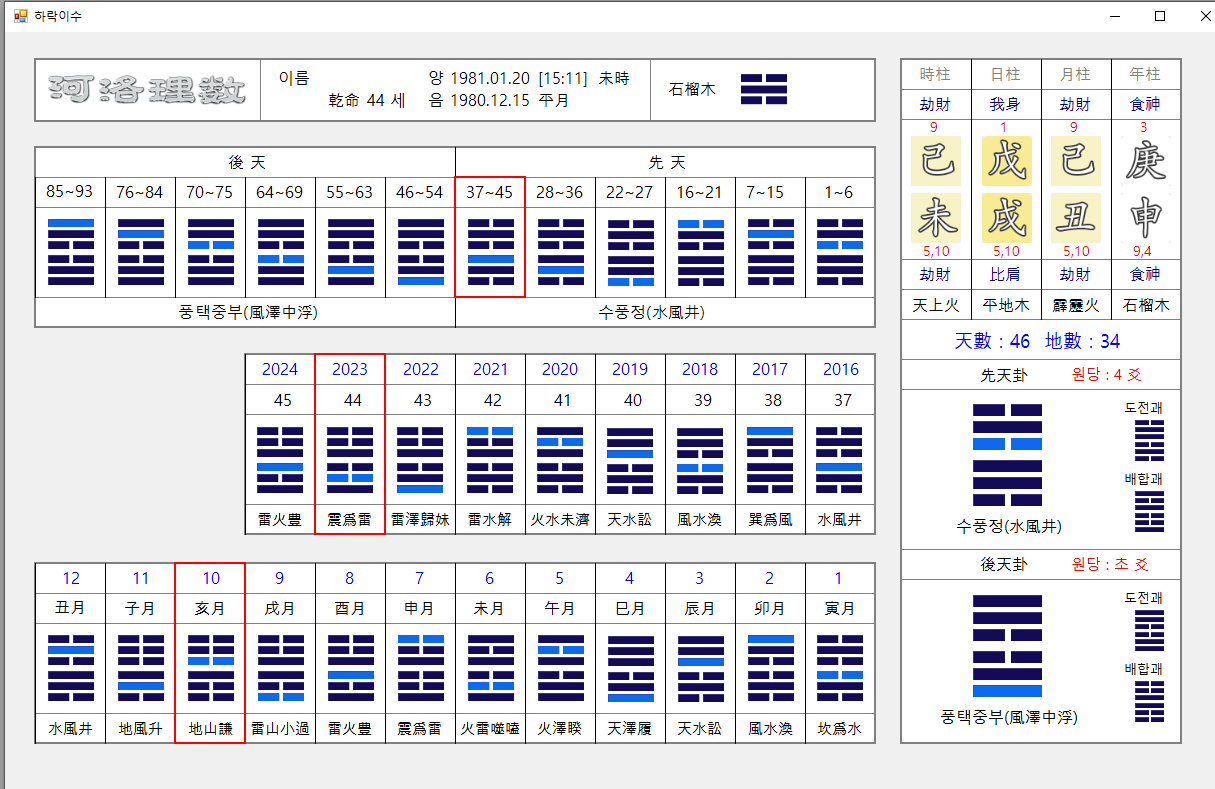 이미 동지를 지났으므로 신유생이되며 나이는 43세 가 되고 선천괘,후천괘도 틀립니다.
