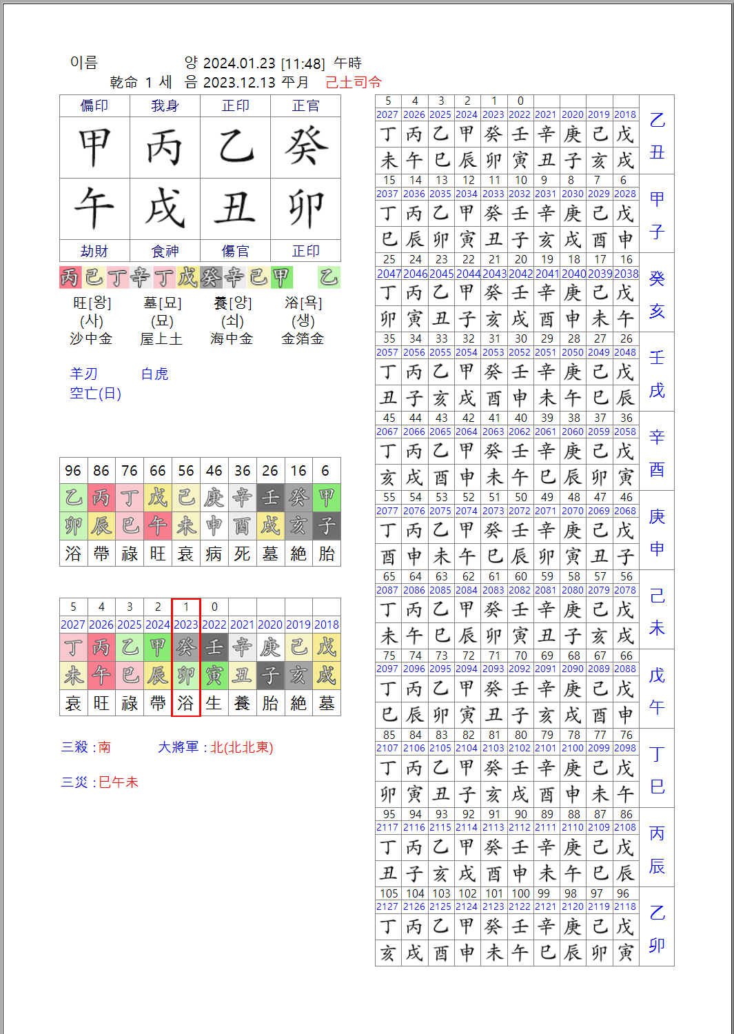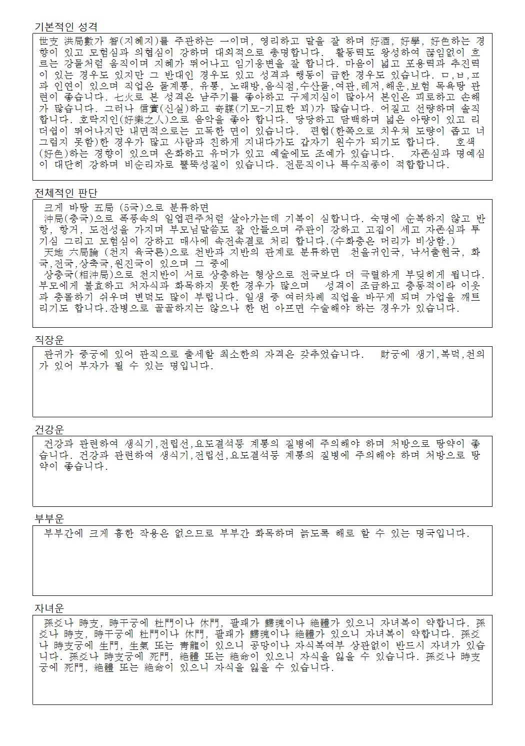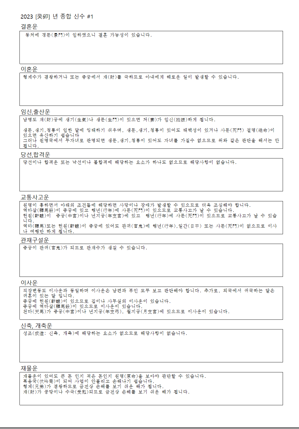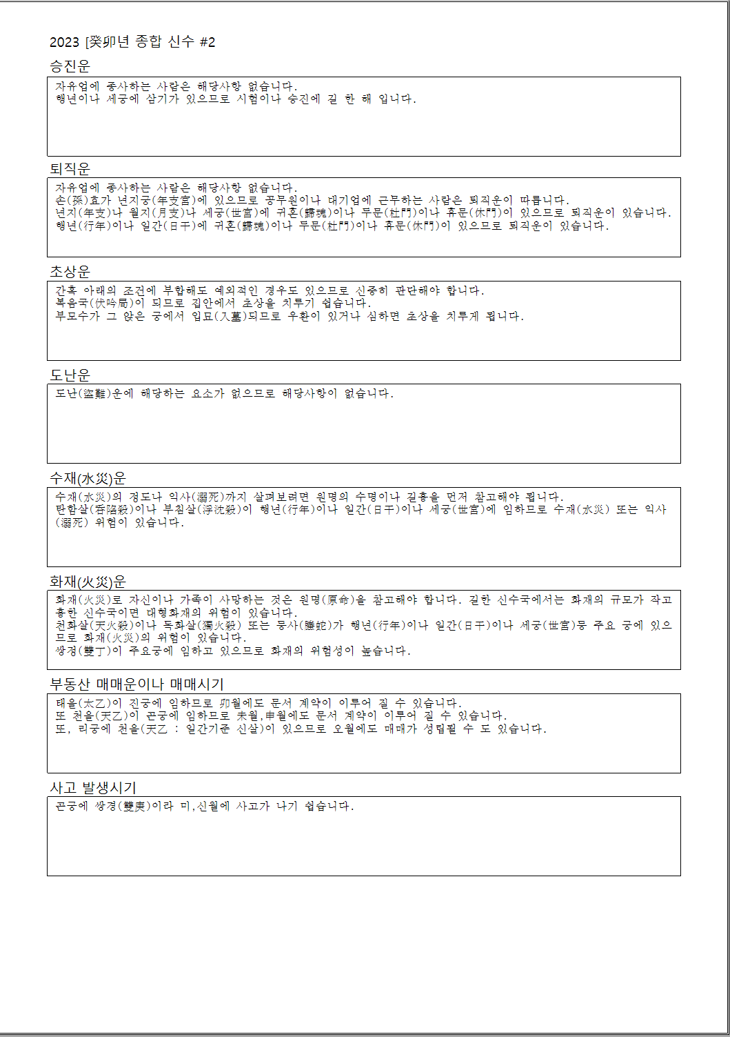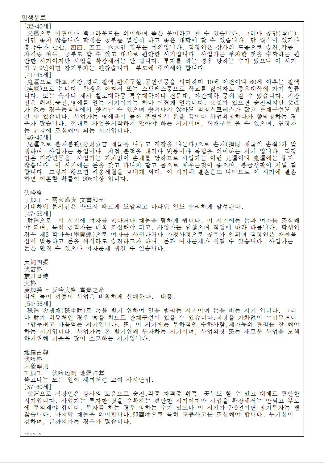 이상 사주원명과 신수에 대한 부분이며, 전체운에 대한 내용도 아래와 같이 보내드립니다.
