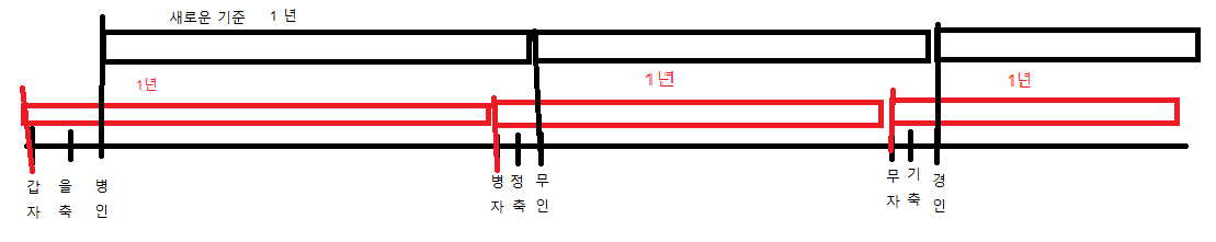 갑자년에 갑자월~을해월까지 12번째월은 상관없으나 13번째 병자월이 오면 해가 바뀌어 을축년으로 바뀌어 버립니다.