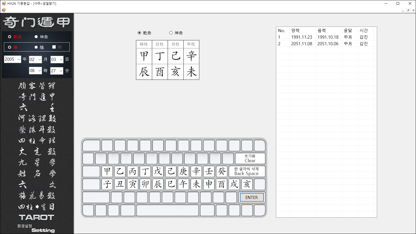 키보드에서 사주를 입력하고 엔터키를 치면 오른쪽 목록에 해당 사주의 생일이 나오는데