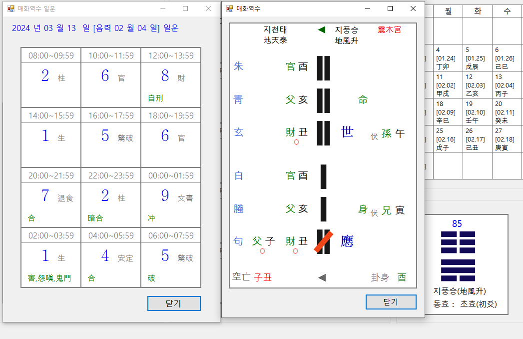 11-1. 일운에서 날짜를 클릭했을 때와 오른쪽 하단 육효버튼 클릭했을 때 나오는 화면 입니다.