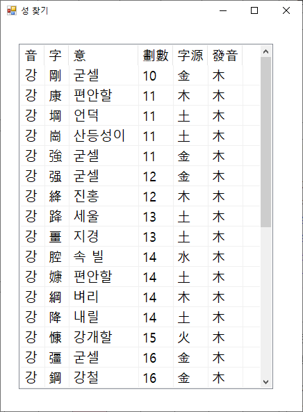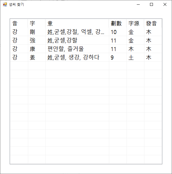 그런데 이 부분도 성씨로 사용되는 '강' 자만 불러오면 되므로 수정된 버전에서는 아래와 같이 성으로 사용되는 글자만 불러오게 됩니다.