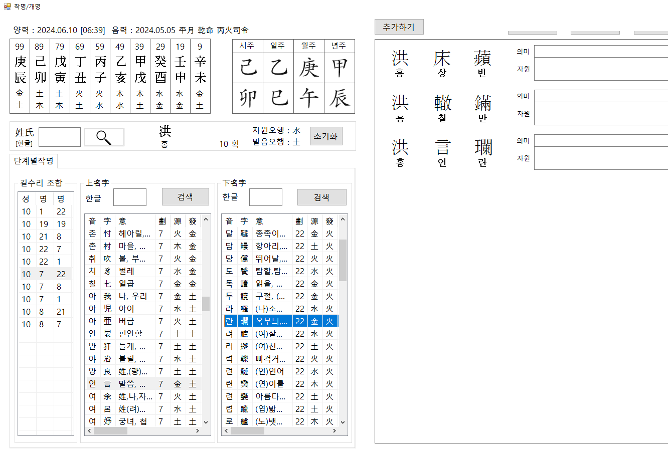 그리고 길 수리 조합에서 하나를 선택하면 상명자목록에 수리에 맞는 글자만 나오고 발음상생과 상관없이
