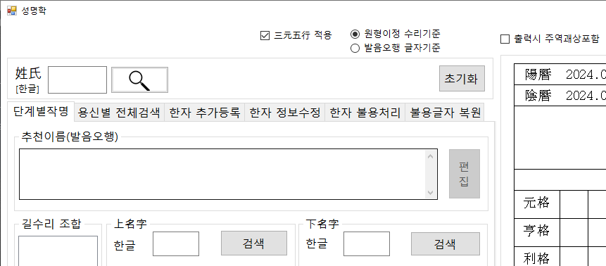 이 체크를 해제하고 사용하시면 됩니다.간혹 길수리 조합이 왜 이것밖에 안되냐고 묻는분이 계시는데 삼원오행 적용에 체크를 해제 하시면모든 길수리 조합이 나옵니다.