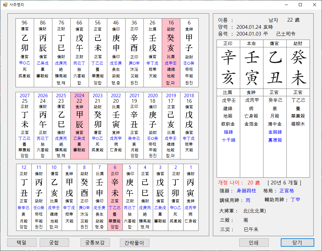 위의 명조는 사주상으로 22살이며 개정된 만나이로는 20세 입니다.