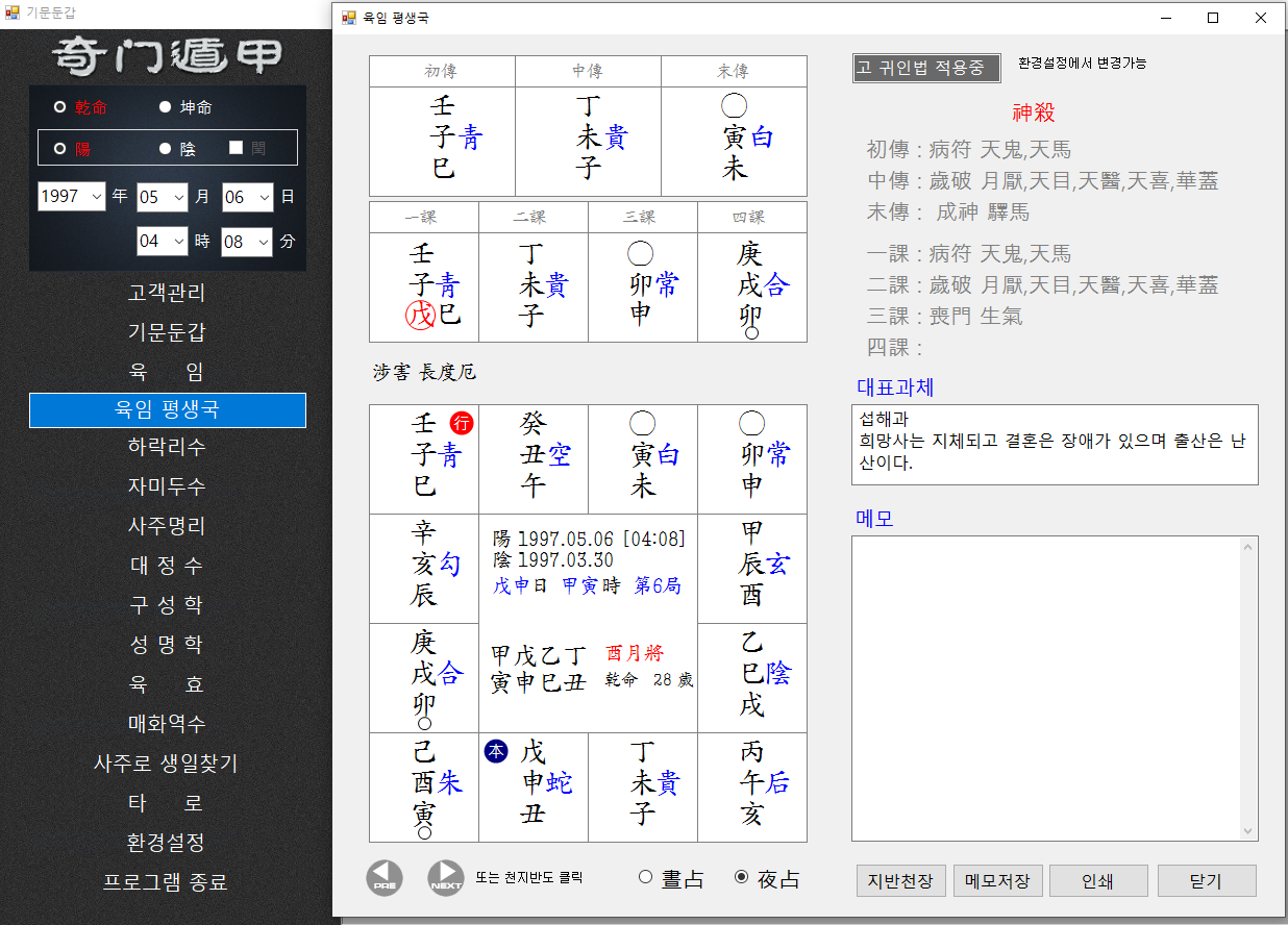 일단 육임버튼을 클릭하고 우측상단에 자신(문점자)의 본명과 성별, 나이를 선택하면 육임 천지반도에 있는 본명과 행년표시가 나이에 맞게 이동합니다.