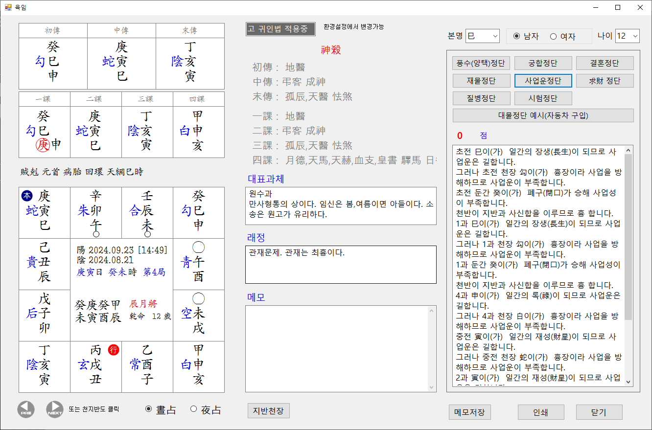 그리고 아래에는 새로 만든 육임프로그램으로 사업운을 클릭한 경우 입니다.