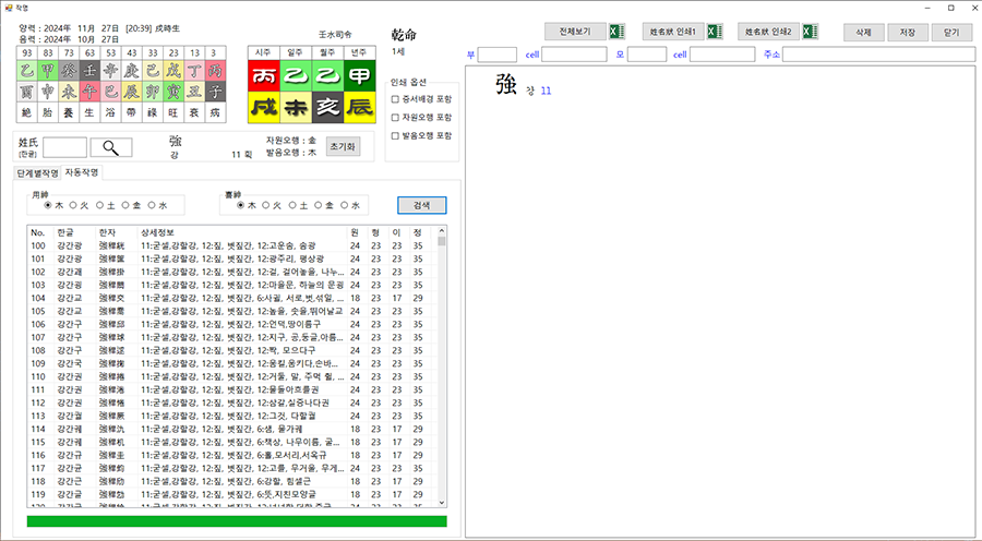 성씨만 검색해서 입력한 다음 사주에 부족한 자원을 선택하고 검색 버튼을 클릭하면 모든 조합을 검색해 줍니다.