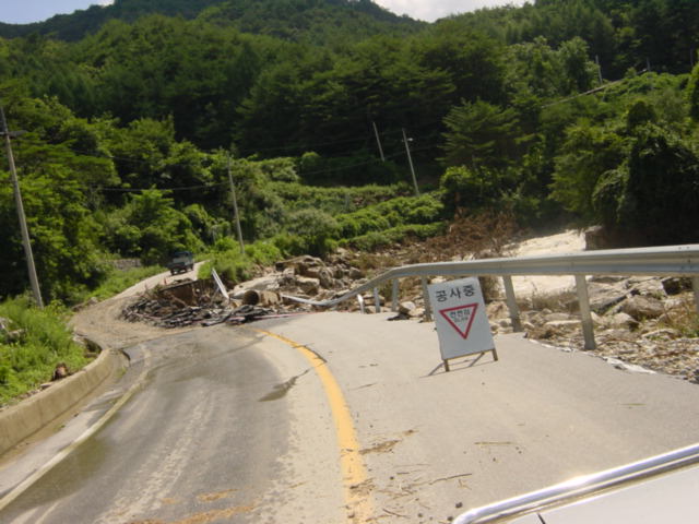 한 참 가다보니 절반이나 유실된 길이 오른쪽으로 꺽여있고 그 옆에는 10여미터의 낭떠러지가 버티고 있다.