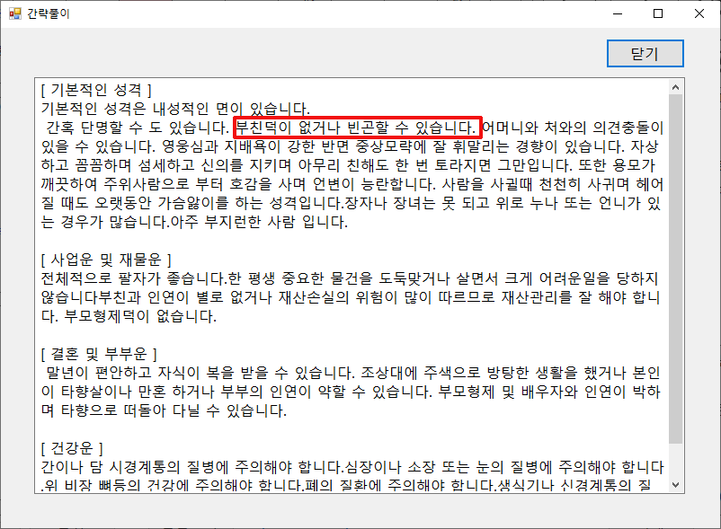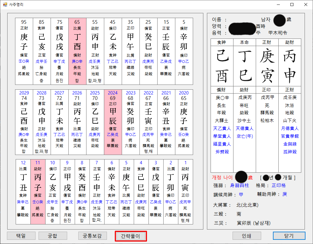그럼, 추가로 사주명리 프로그램에 최근에 추가한 간략풀이 버튼 클릭시 나오는 내용도 함께 보겠습니다.