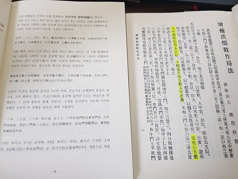 우측에 명문당본은 惟地局五數 入中則順乾 爲本宮數, 不變也干局五數入中逆离 이렇게 되어 있고