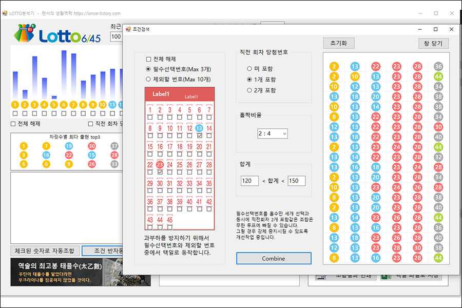 체크된 숫자로 자동조합 버튼 옆에 '조건 반자동 조합' 버튼을 만들었습니다.