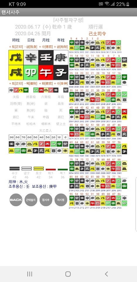 위의 화면이나 그 위에 있는 화면에서 동일하게 사주의 일간을 터치하면 ( 이 사주에서는 辛을 터치하면)