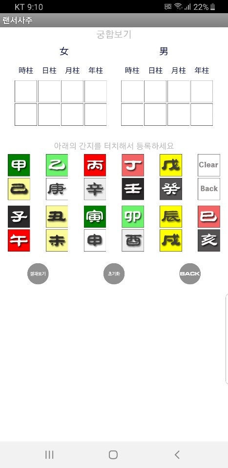 남녀 사주를 다 입력후에 결과보기를 터치하시면 됩니다.