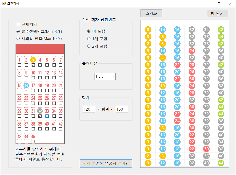 이 프로그램은 회차에 대한 분석을 도와주는 프로그램이지 당첨을 보장하는 기능이 아닙니다.