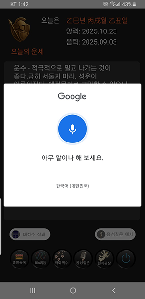 음성질문은 음성으로 질문하면 육임으로 판단해서 답을 음성과 문자로 해 주는 기능인데,