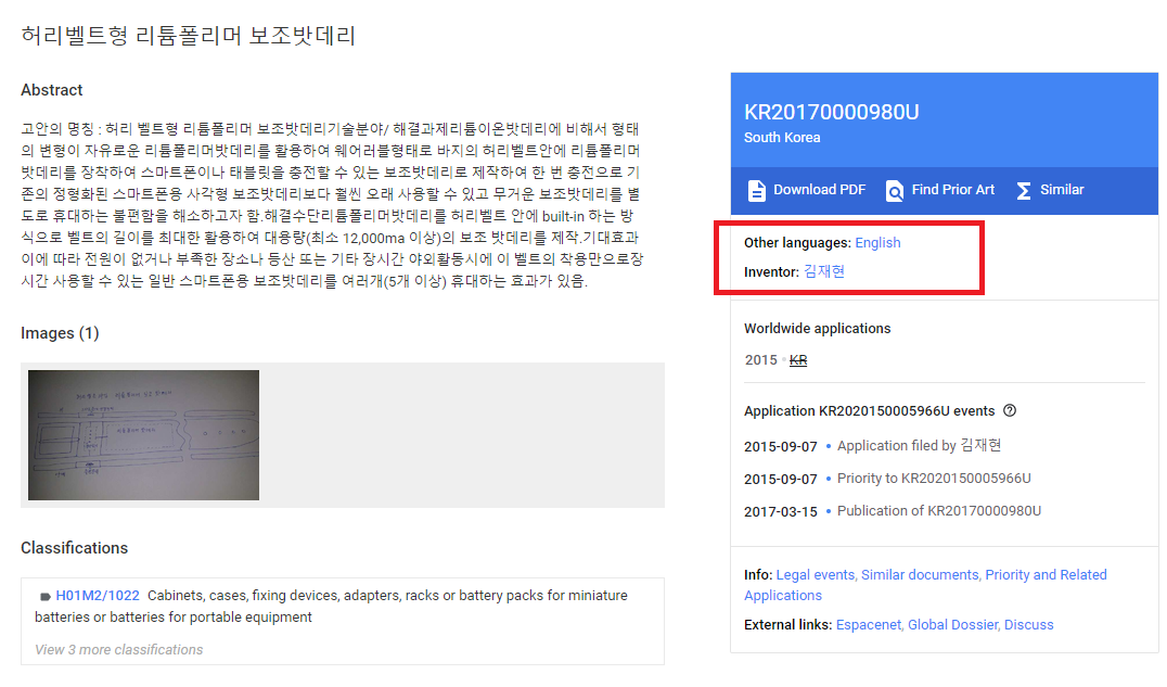 허리벨트형 보조밧데리 실용신안 출원은 2015년 9월에 했는데