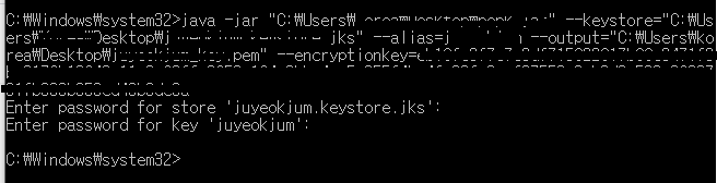위의 그림과 같이 키스토어 패스워드와 키 패스워드를 입력하면 바탕화면에 아무이름이나.pem 파일이 생성되어 있을 겁니다.