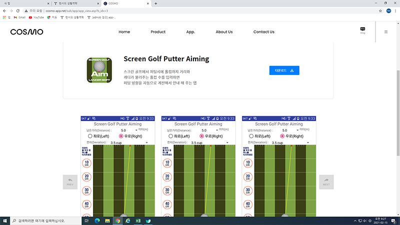 제 홈페이지의 App. 소개 란에 있는 스크린 골퍼 퍼팅방향을 알려주는 제가 만든 어플입니다.