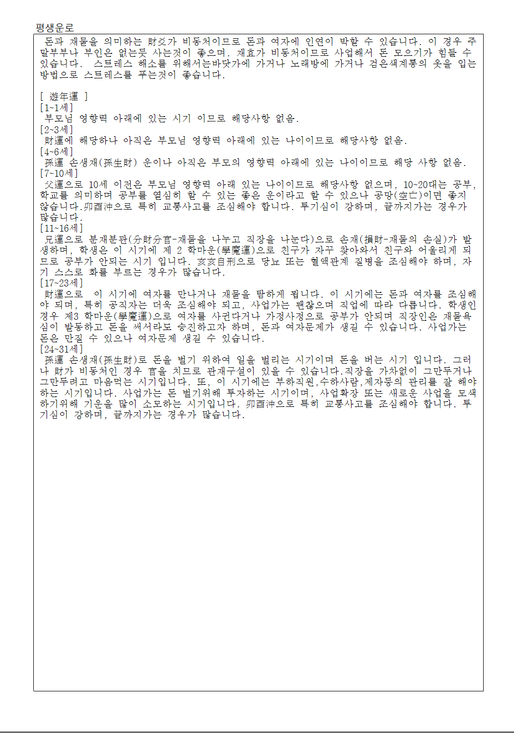 이상 사주원명과 신수에 대한 부분이며, 전체운에 대한 내용도 아래와 같이 보내드립니다.