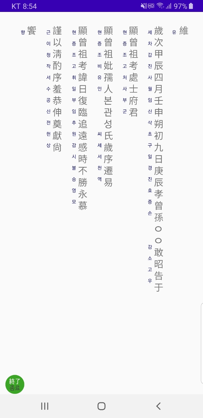 축문에 대한 뜻 풀이는 이미 '축문쓰는 법'이라는 글에서도 올렸고 제 어플에도 상세히 나옵니다.