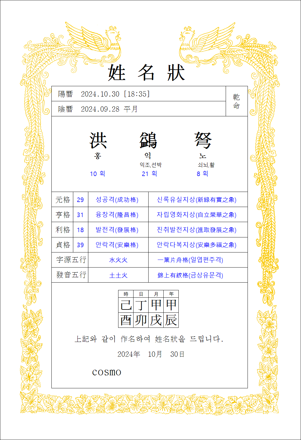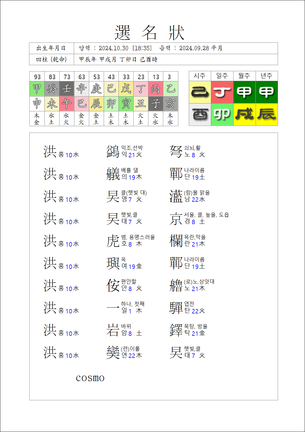 작명하기 화면에서 하나를 선택해서 성명장을 인쇄하면 아래와 같이 나옵니다.