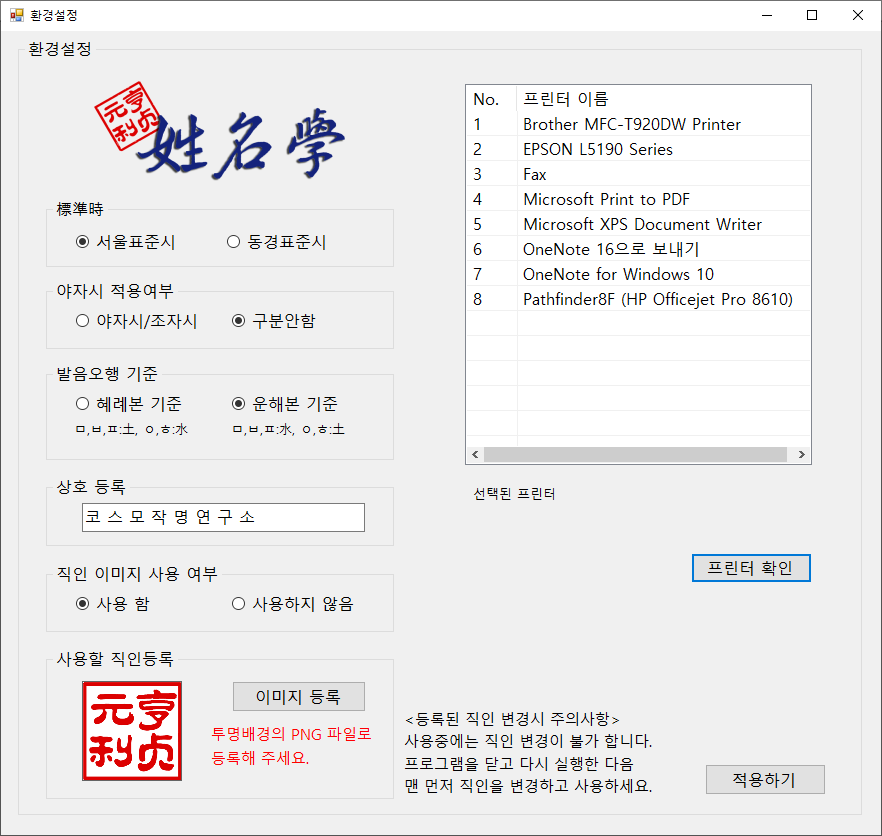 야자시조자시 구분하는 기능과 해례본,운해본 구분기준 상호등록 및 직인이미지 등록 기능이 있습니다.