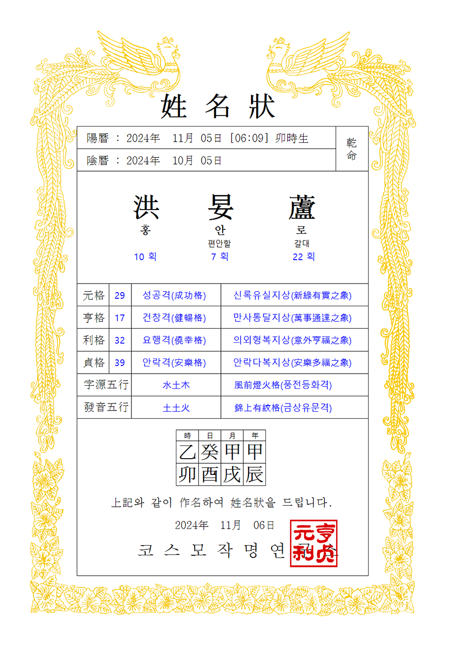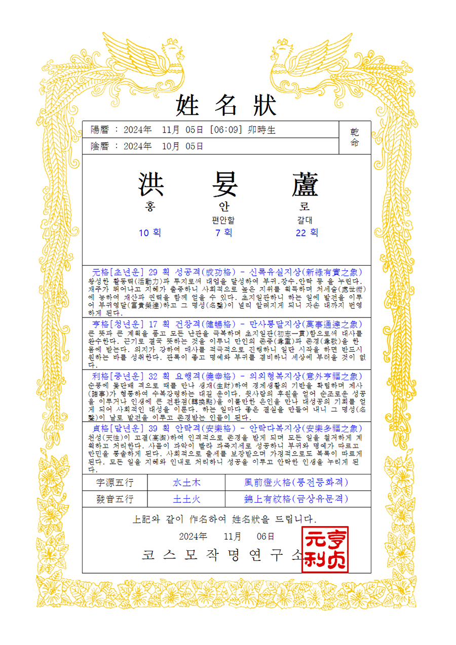 자원오행, 발음오행, 삼원오행, 수리음양, 주역괘상 표시 됩니다.