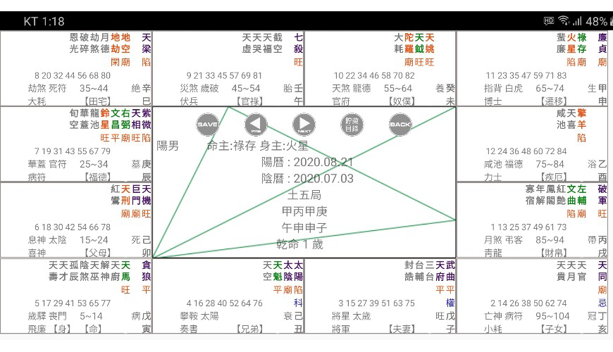 자미두수 어플리케이션으로 가로화면 세로화면 전환기능을 지원하며 태블릿에서도 이용이 가능합니다. 음성으로 포국하는 기능 지원됩니다. 남자 음력 1945년8월7일 자시 또는 01시 20분 모두 지�